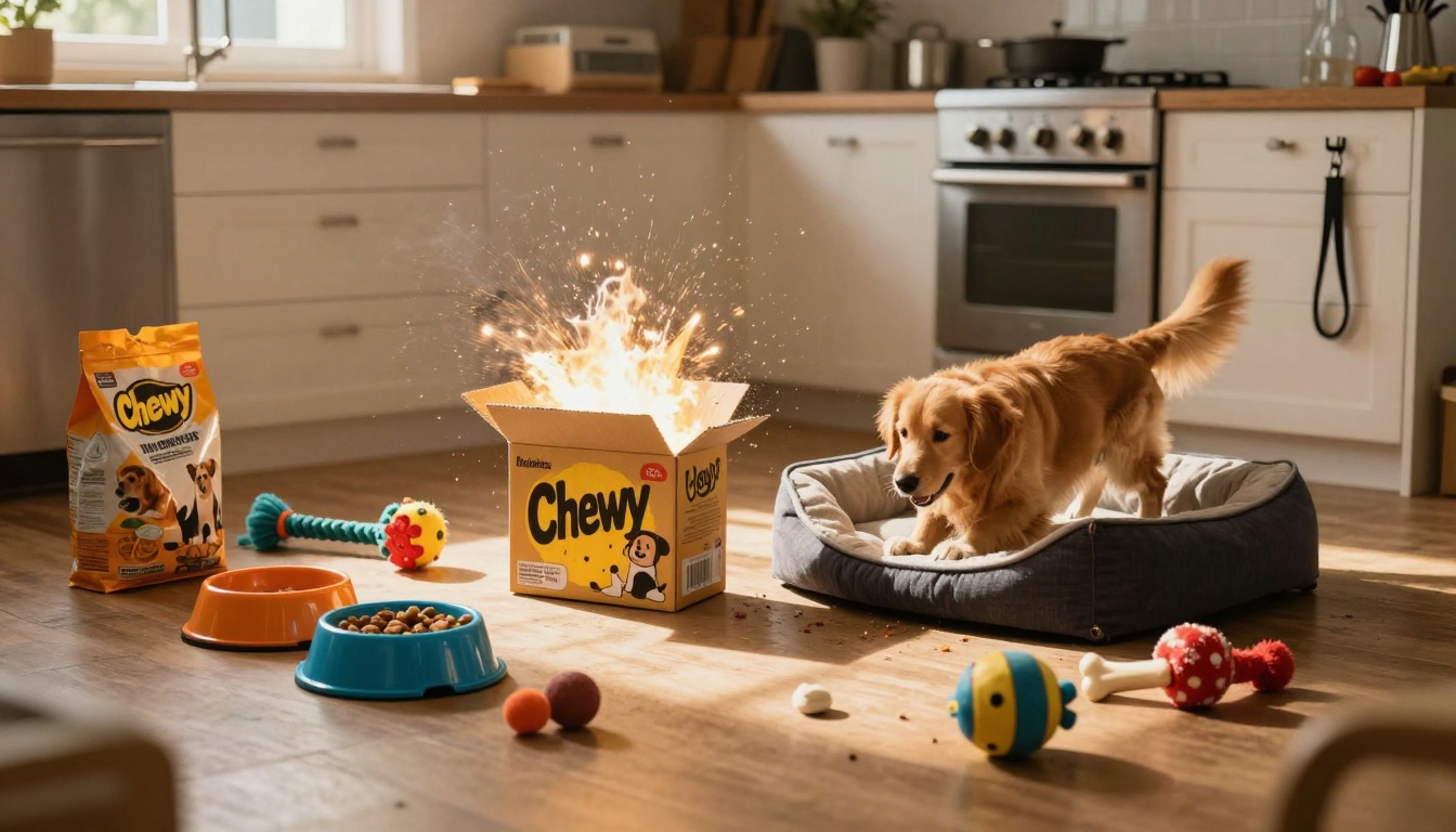 This prompt creates a scene in which a box filled with products from Chewy.com explodes in a cinematic product placement fashion.
