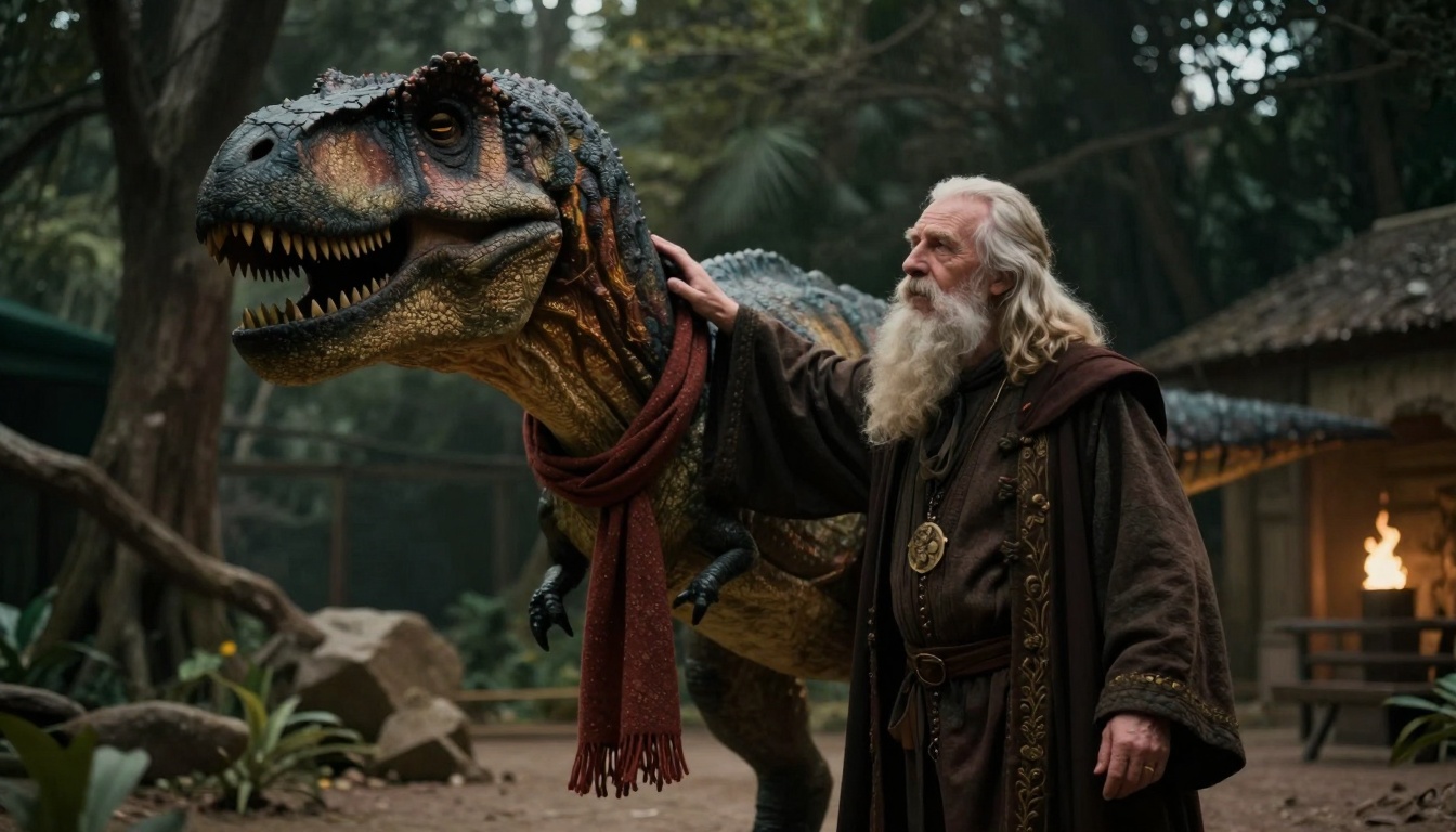 A cozy cinematic scene of a wizard petting a T-rex at a night zoo, infused with warm tones and vintage film aesthetics.