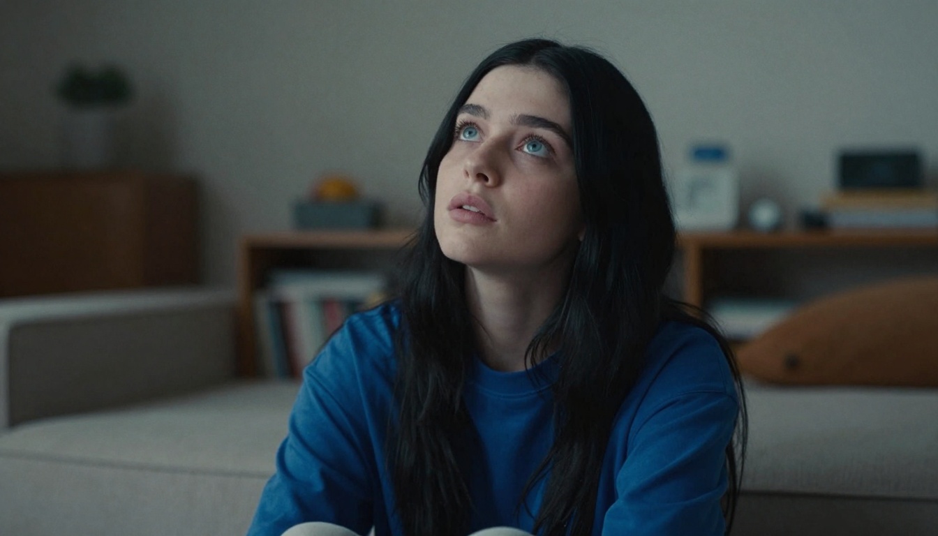 A young woman gazes at the sky in a warm, vibrant living room during golden hour, captured in a cinematic style.