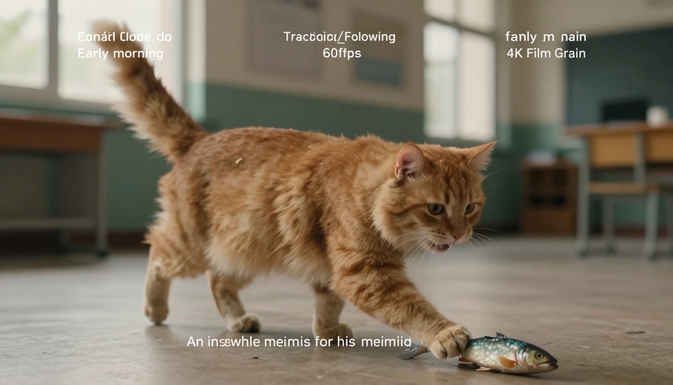 A humorous short video of an orange cat searching for its fish in a school hall, captured with a cinematic style.