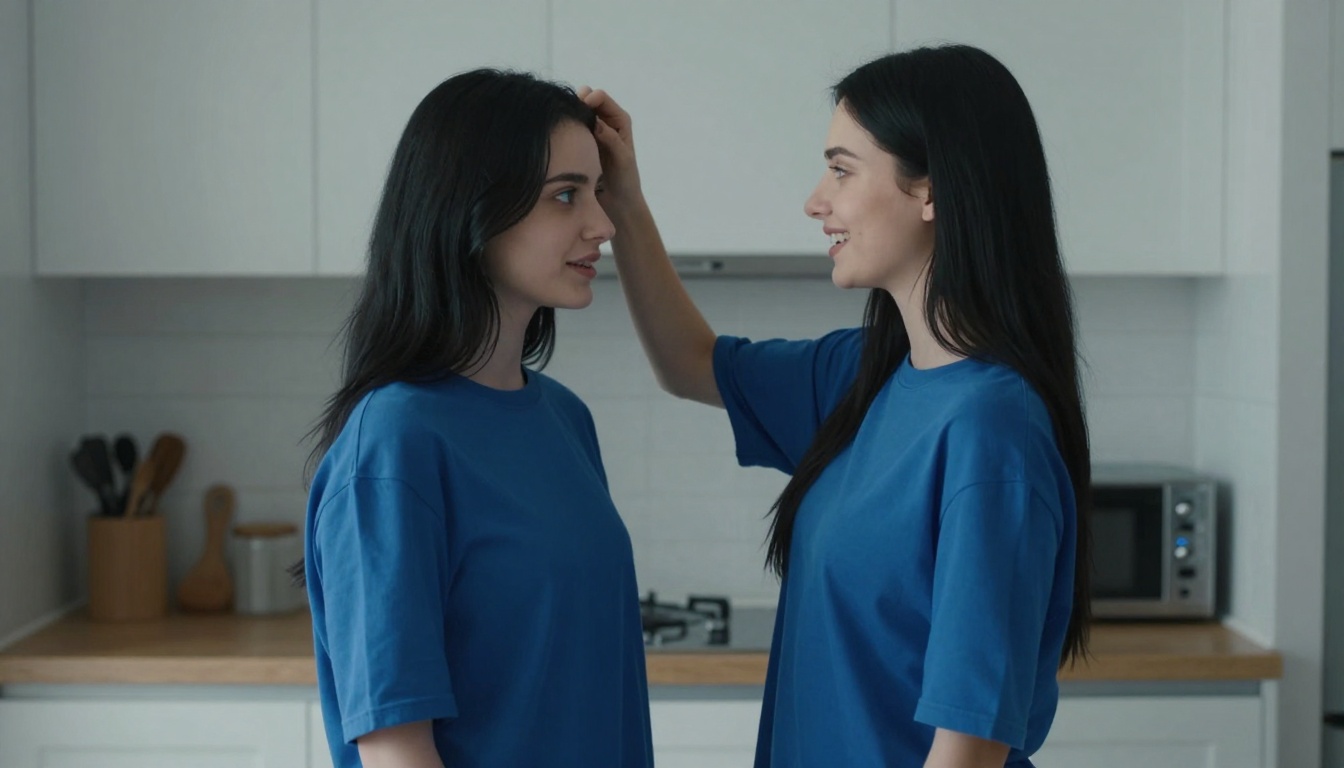 A young woman shares a warm moment in her kitchen, smiling and speaking during golden hour.