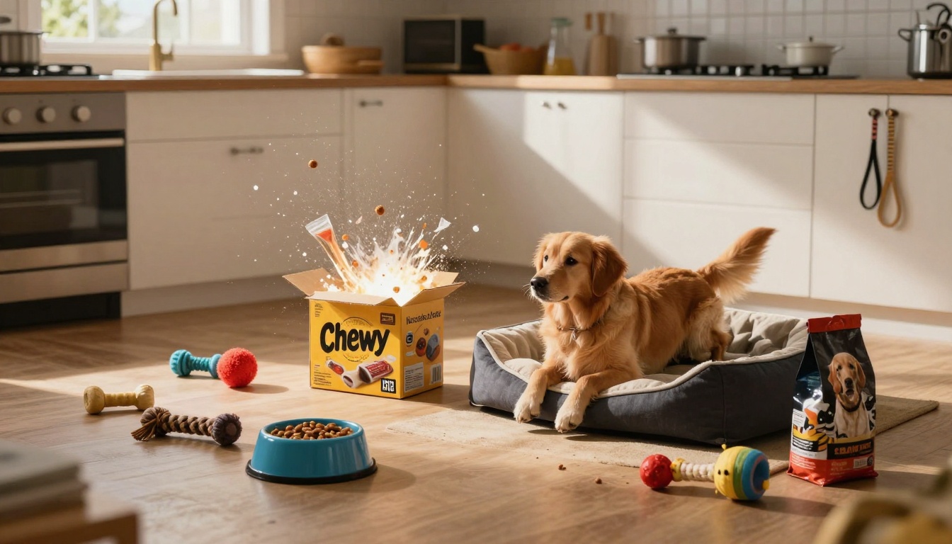 A sunlit kitchen scene where a Chewy box bursts open and assembles pet supplies as a dog happily settles in.