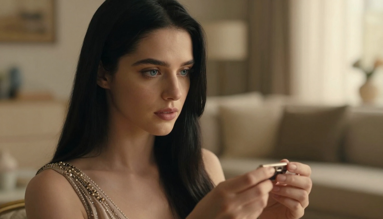 A close-up of a young woman in a warm-lit living room, examining an object with a cinematic, personal touch.