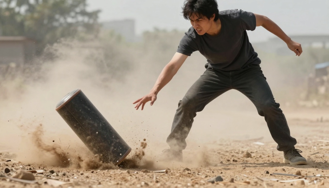 A Poseidon statue fiercely slams a base to the ground at a hotel entrance during golden hour, capturing intense motion.