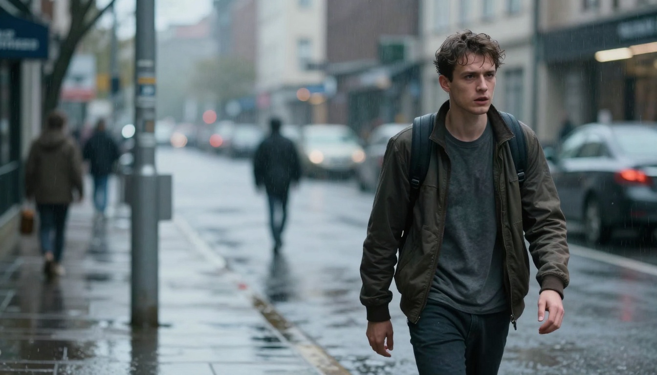 A young man walks desperately in a rainy urban street, evoking a melancholic mood with realistic visuals.