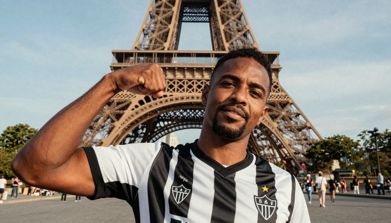 A 40-year-old man in an Atlético Mineiro shirt welcomes viewers at the Eiffel Tower in the morning light.