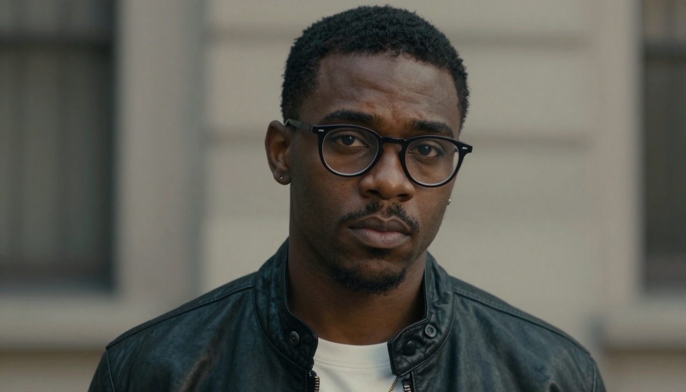 A serious young black man in a stylish outfit stands still in a vibrant, neon-lit street at night.