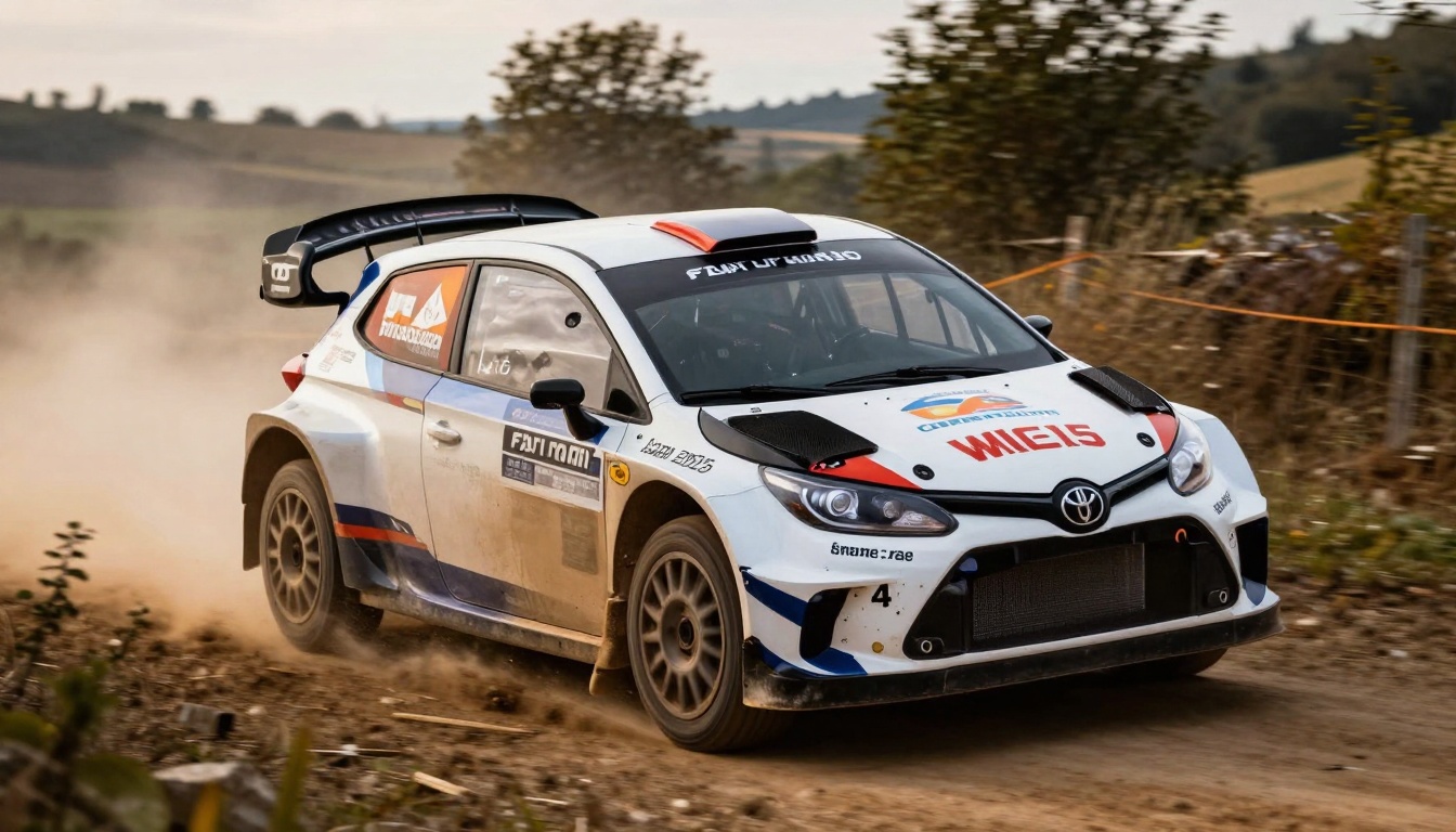 A cinematic shot of a Toyota Yaris WRC driving on a hill, focusing on its engine in slow motion with warm autumn lighting.