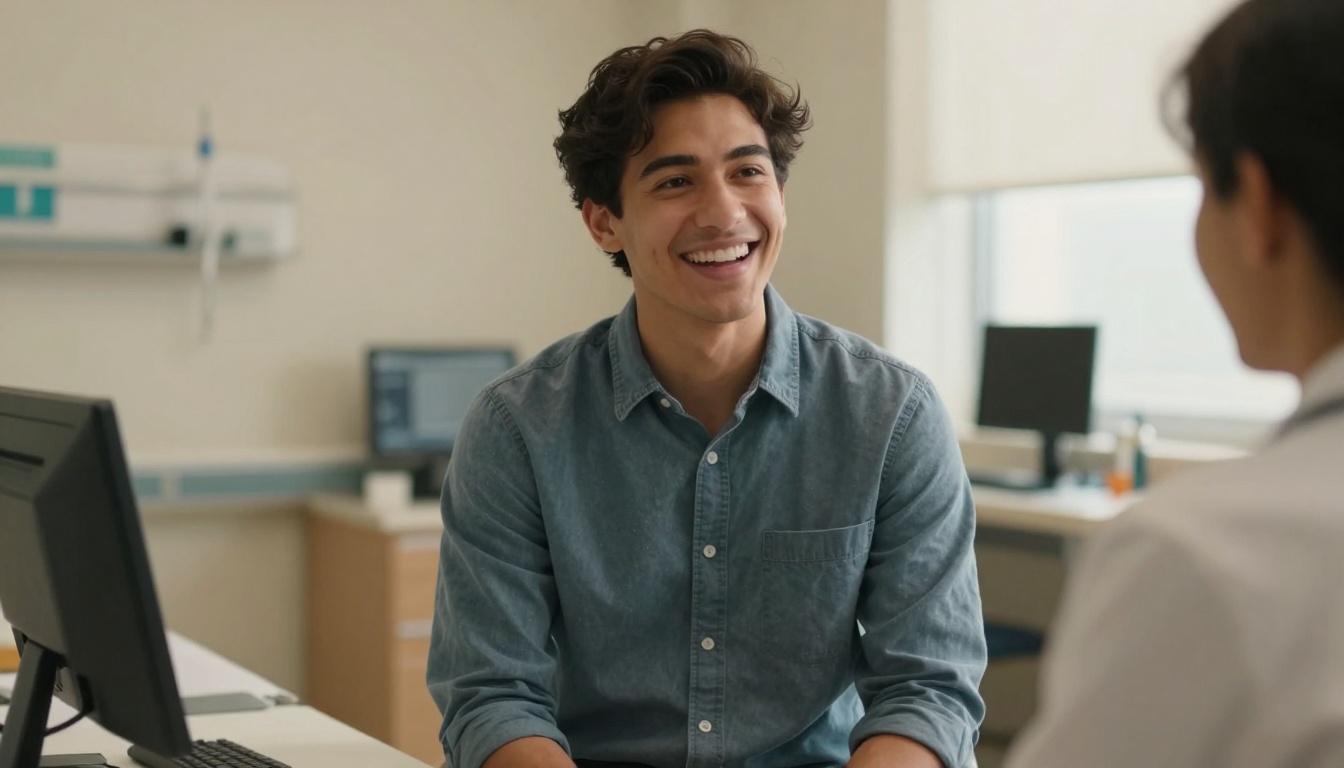 A relaxed scene of a young man expressing happiness in a hospital doctor's office with warm, natural lighting.