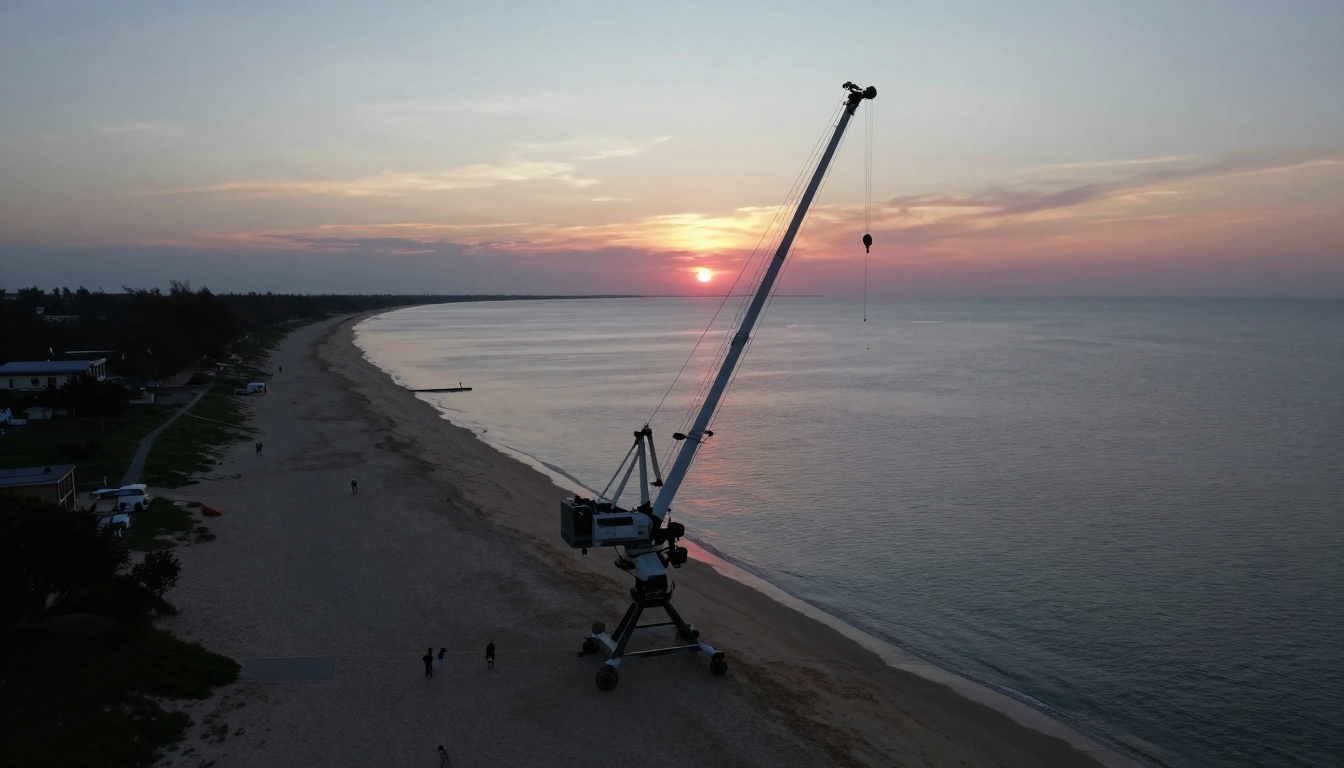 Aerial view of a beach at sunset during blue hour, showcasing a serene atmosphere with ascending drone motion.