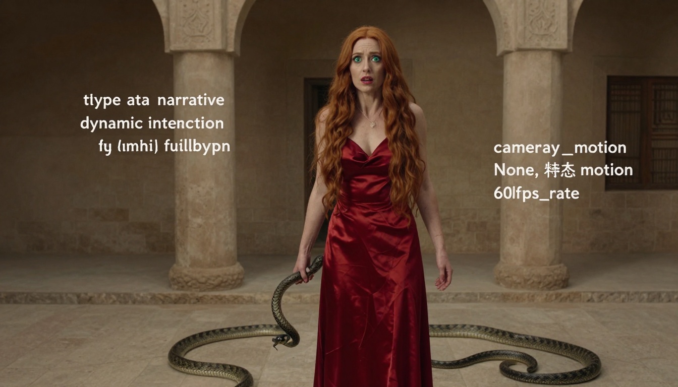 A woman in a scarlet dress stands in awe of a snake in a vibrant tropical rainforest, captured in vivid realism.