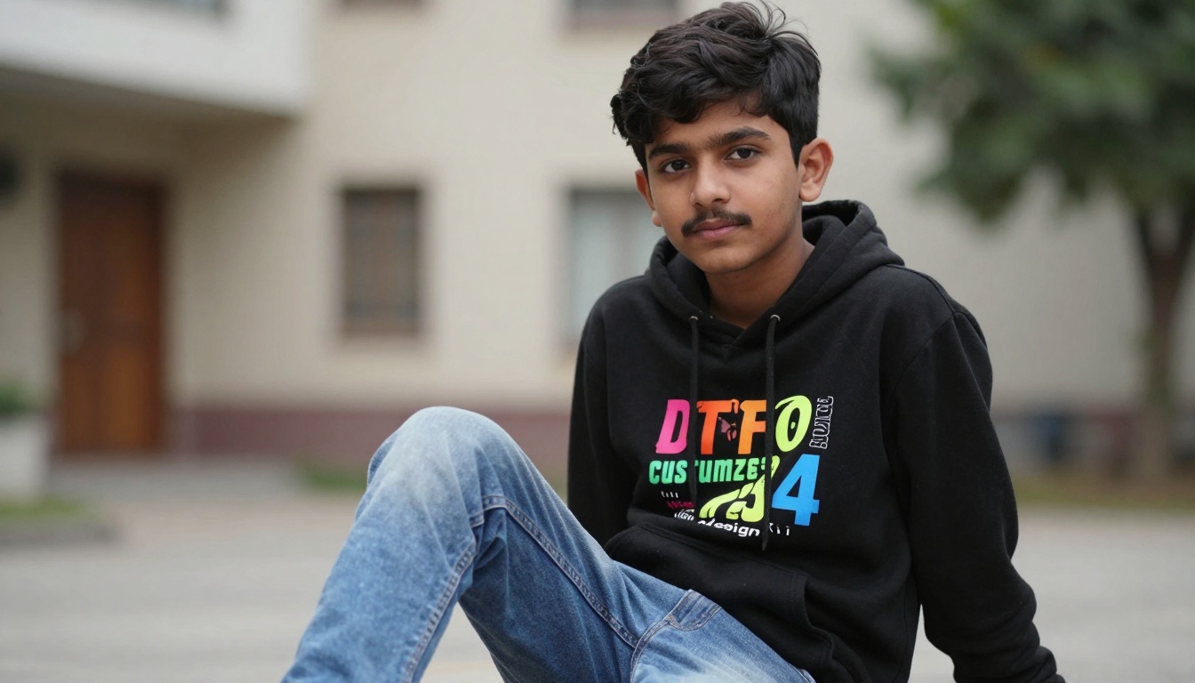 A young Pakistani boy gazes at the sunset over Karachi's beach, dressed in stylish casual wear.