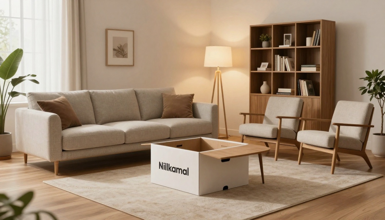 A modern living room dynamically transforms as stylish furniture assembles from a Nilkamal box, creating a cozy space.