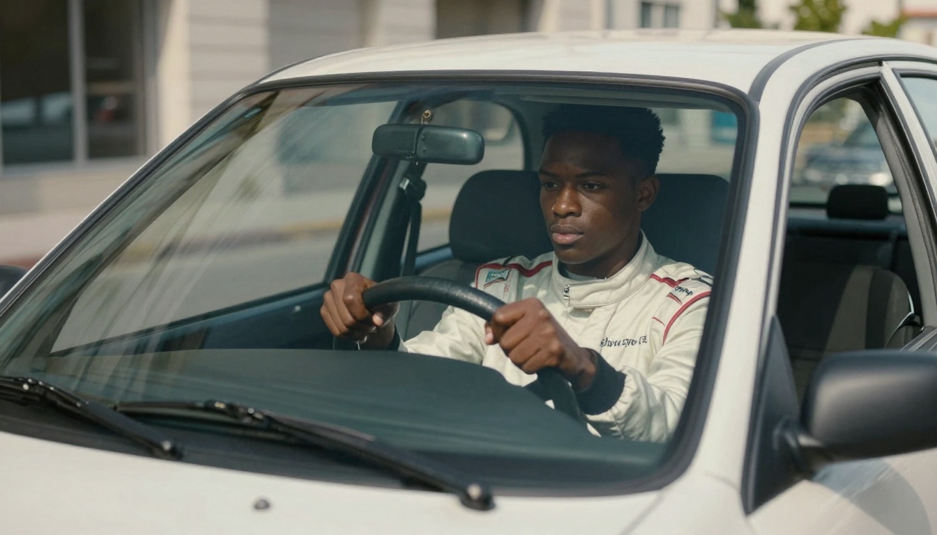 A young black man dressed as an F1 pilot humorously sits in a small car, captured with a shallow depth of field.