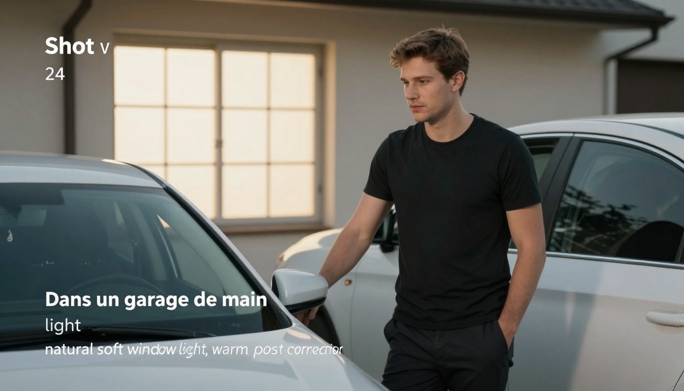 A handsome man in casual attire enters his car with a smile, captured in a professional, warm-lit garage setting.
