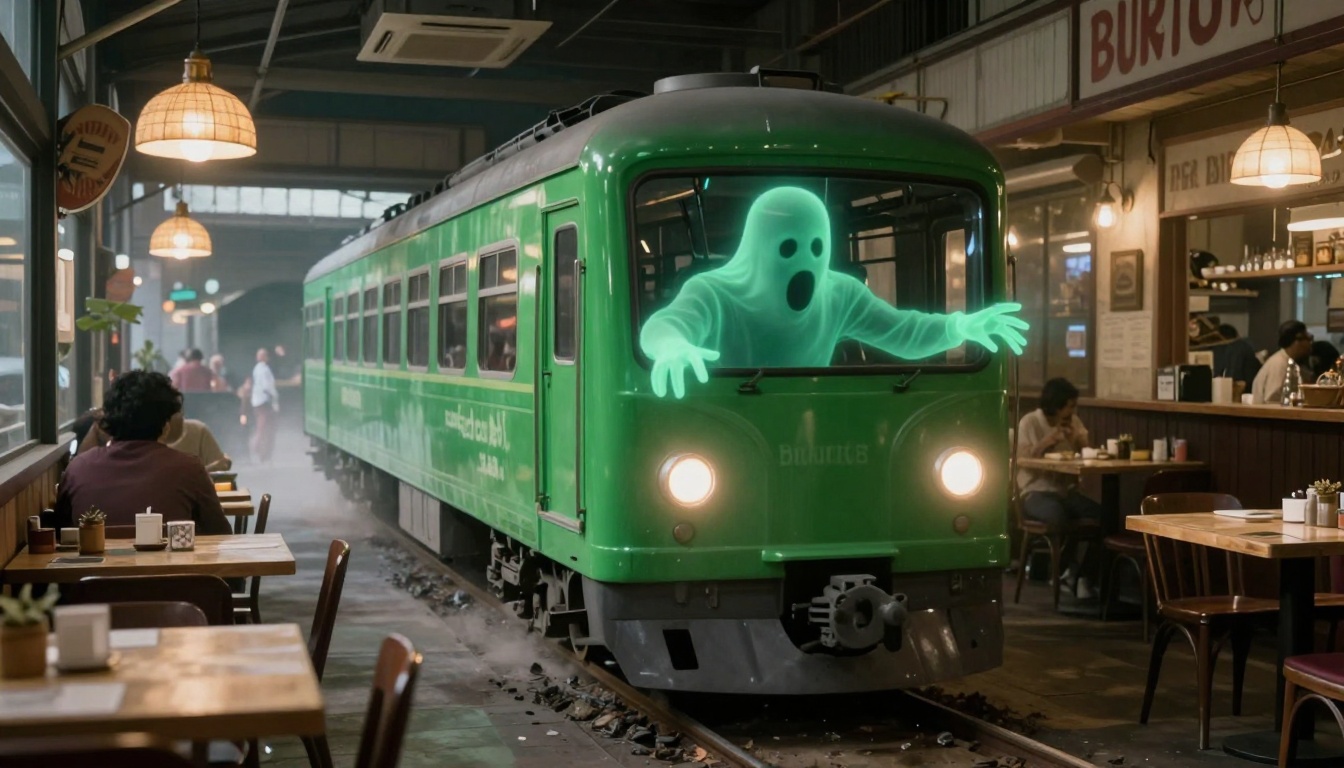 A realistic green ghost of Bobby Bacala drives a ghost train crashing into a restaurant, accompanied by screaming sounds.