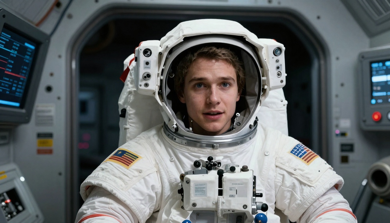 A young male astronaut speaks casually in a starship at night, capturing a personal vlog atmosphere with cold tones.