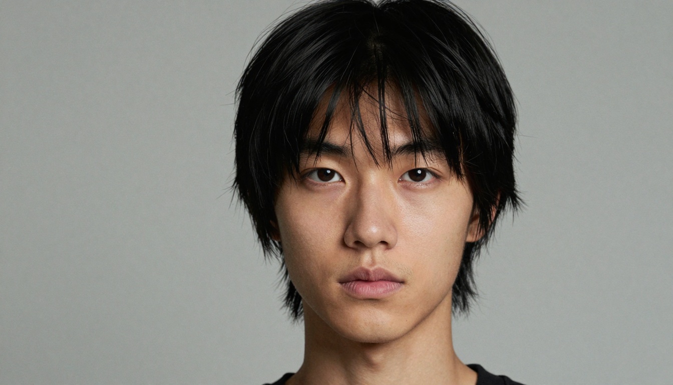 descriptionName : Andi, asian, He has straight, thick black hair that is styled short with a casual, tousled fringe. His skin is smooth with an even, light-toned complexion. His face is defined by a strong jawline, high cheekbones, and a straight nose. His eyes are a deep, dark brown, with a slight epicanthic fold that gives them an almond shape. He has full lips and a neutral expression. His overall build appears to be slim with a lean, athletic neck and shoulders.wardrobeblack leather bomber jacket over a vertical-striped button-up shirt. Underneath, a mustard-colored turtleneck adds a pop of color. The look is grounded by a pair of black slim-fit jeans and sleek, high-shine black leather boots. A black belt with a metallic buckle completes the cohesive, modern yet retro aesthetic. The ensemble combines classic rock-and-roll elements with contemporary fashion.actionMale figure sitting on edge of a unique and artistic chair. It is a single piece, molded from a metallic, highly reflective material. The surface is not smooth but is composed of countless horizontal, undulating ridges, giving it the appearance of a topographic map or a meticulously carved sculpture. The chair's form is organically curved and asymmetrical, resembling a large, polished rock or a futuristic pod. It sits low to the ground and has a fluid, dynamic shape. expression calm, neutral