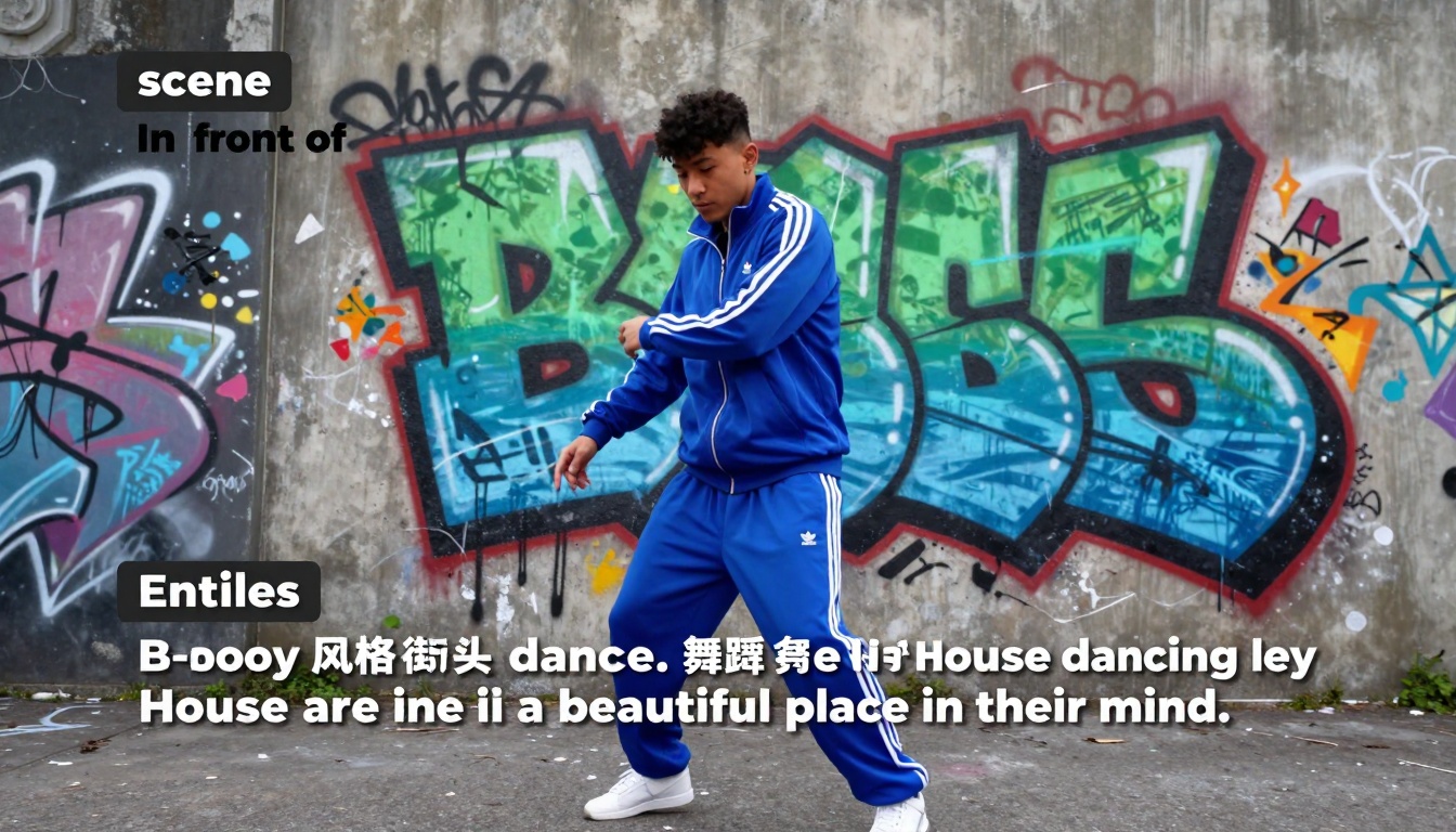 A street dancer performs House dancing in front of a graffiti wall in a vibrant, daylight setting.