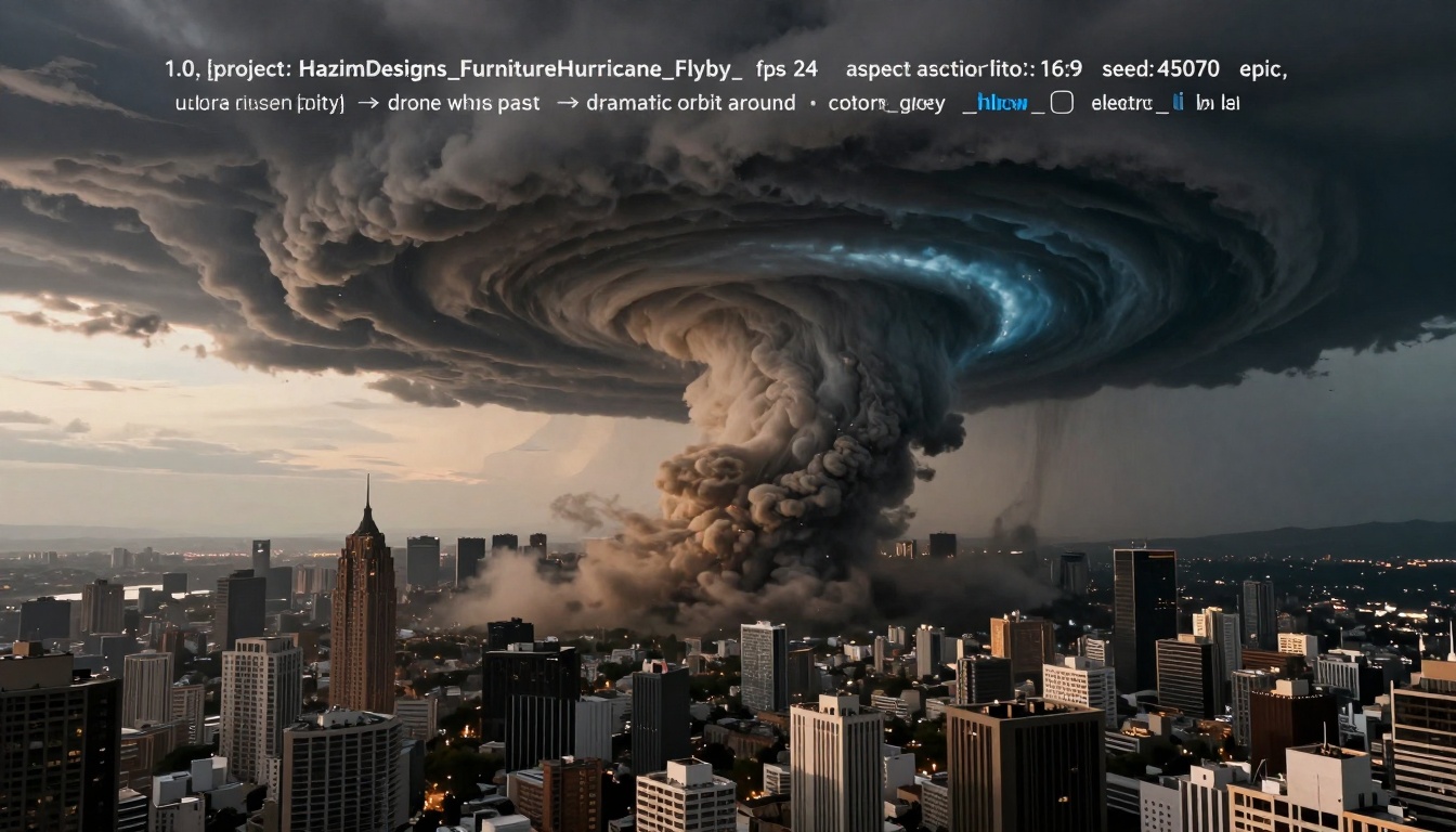 Epic drone flyby of a city engulfed by a glowing hurricane, showcasing swirling furniture in a dramatic, surreal spectacle.