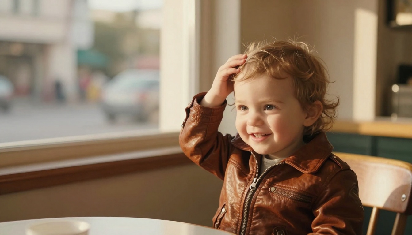 A cozy scene of a one-year-old in a vintage jacket, enjoying ice cream in warm, soft lighting.