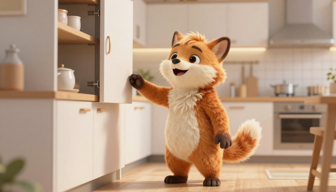 Yasik, an anthropomorphic character, presents a modern kitchen with a cheerful demeanor in photorealistic animation.