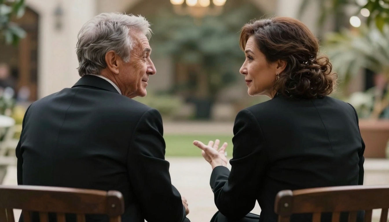 A fine dining scene of an older man and middle-aged woman in elegant attire, engaged in conversation, captured in atmospheric black and white.