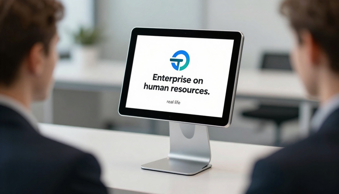 A realistic portrayal of a thin metal totem with an e-paper screen in a corporate setting, showcasing HR information.
