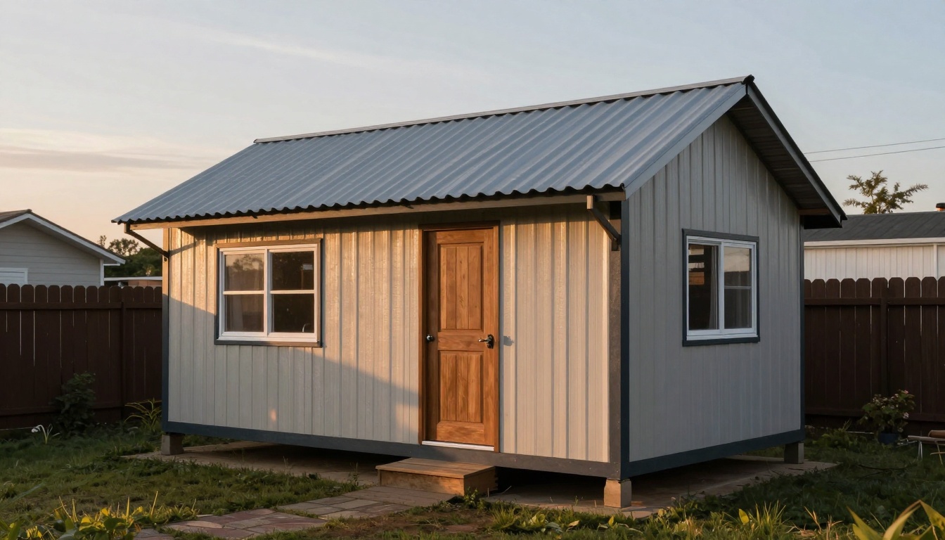 A whimsical kids cabin in a backyard at dawn, featuring unique architecture and warm, inviting tones.