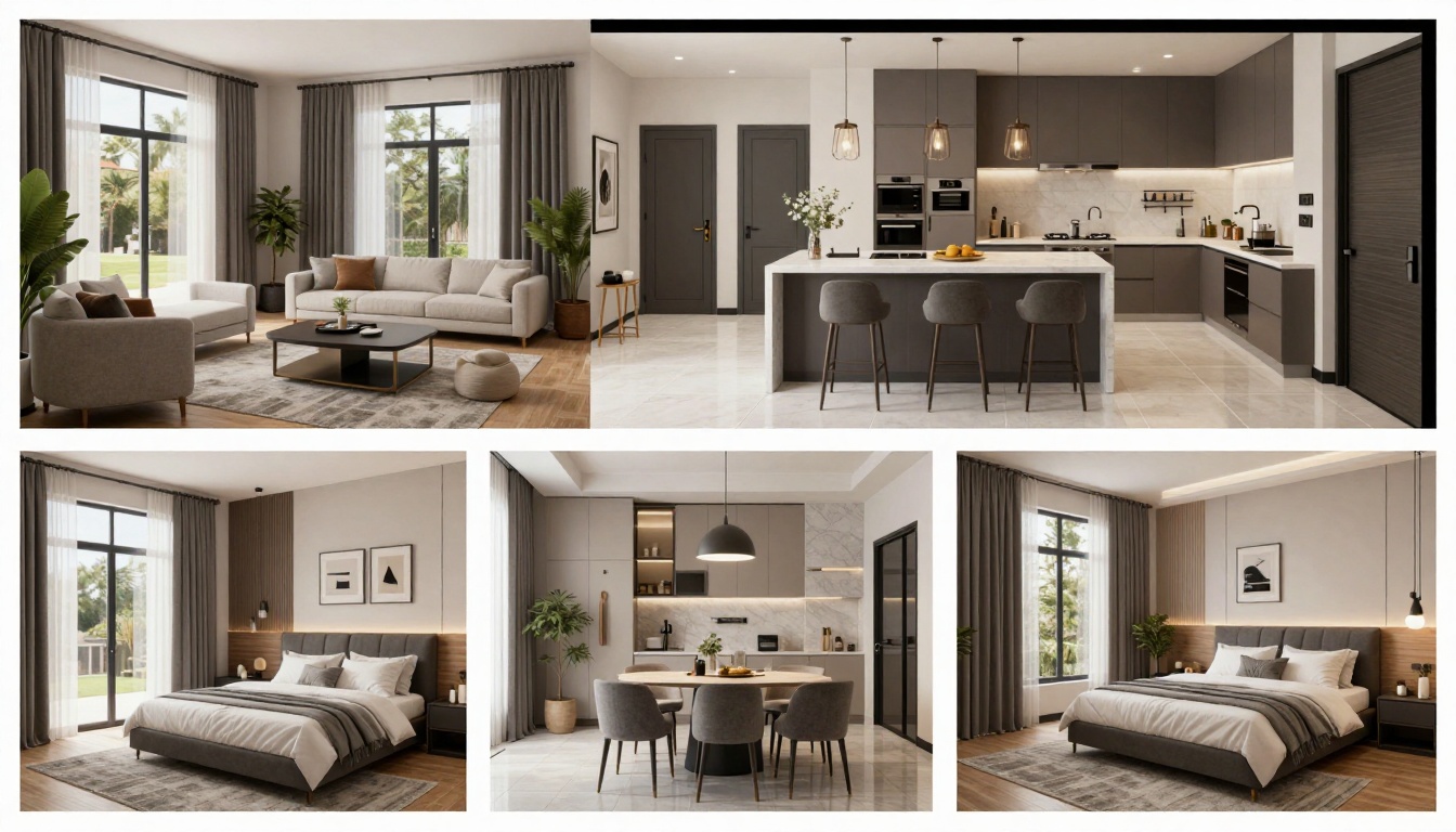 A 3D animated walkthrough of a modern minimalist house, showcasing exterior and interior designs in various segments.