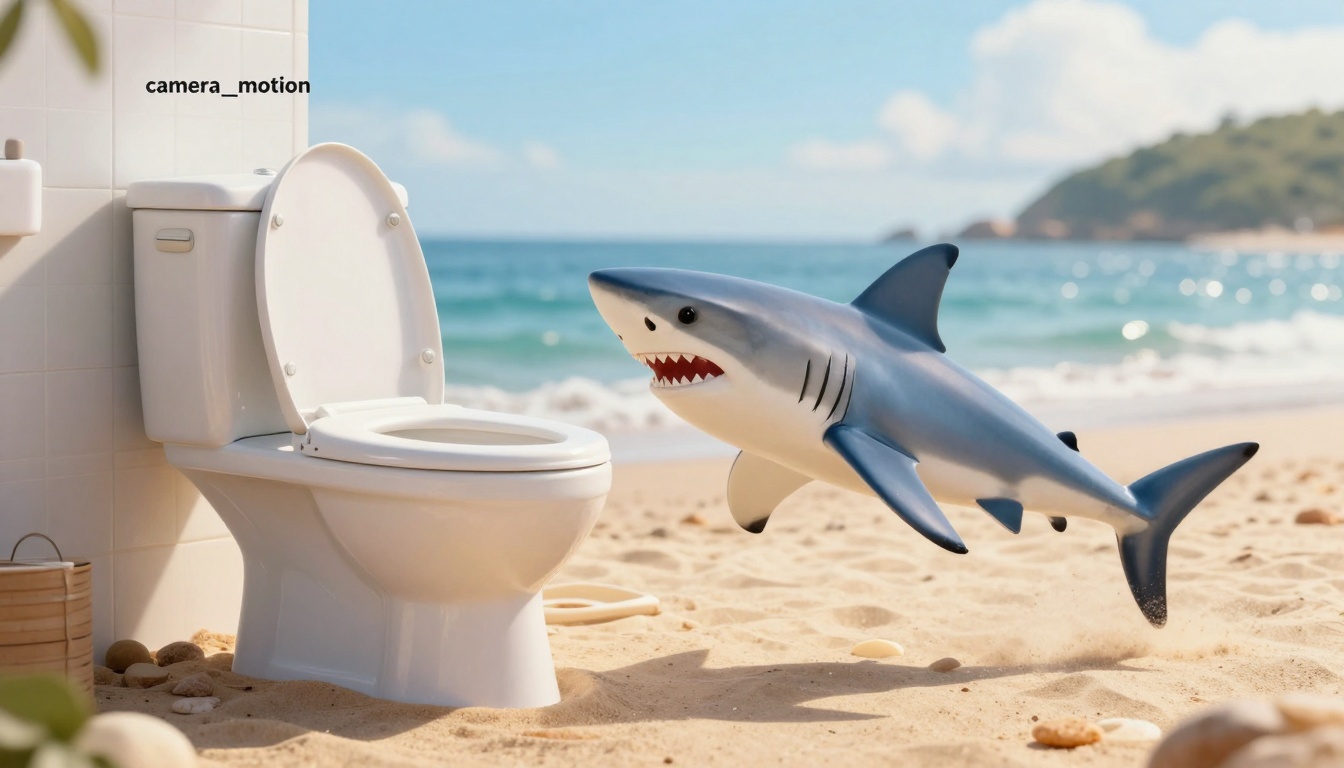 A cozy beach scene with a toilet transforming into an angry blue and white shark attacking.