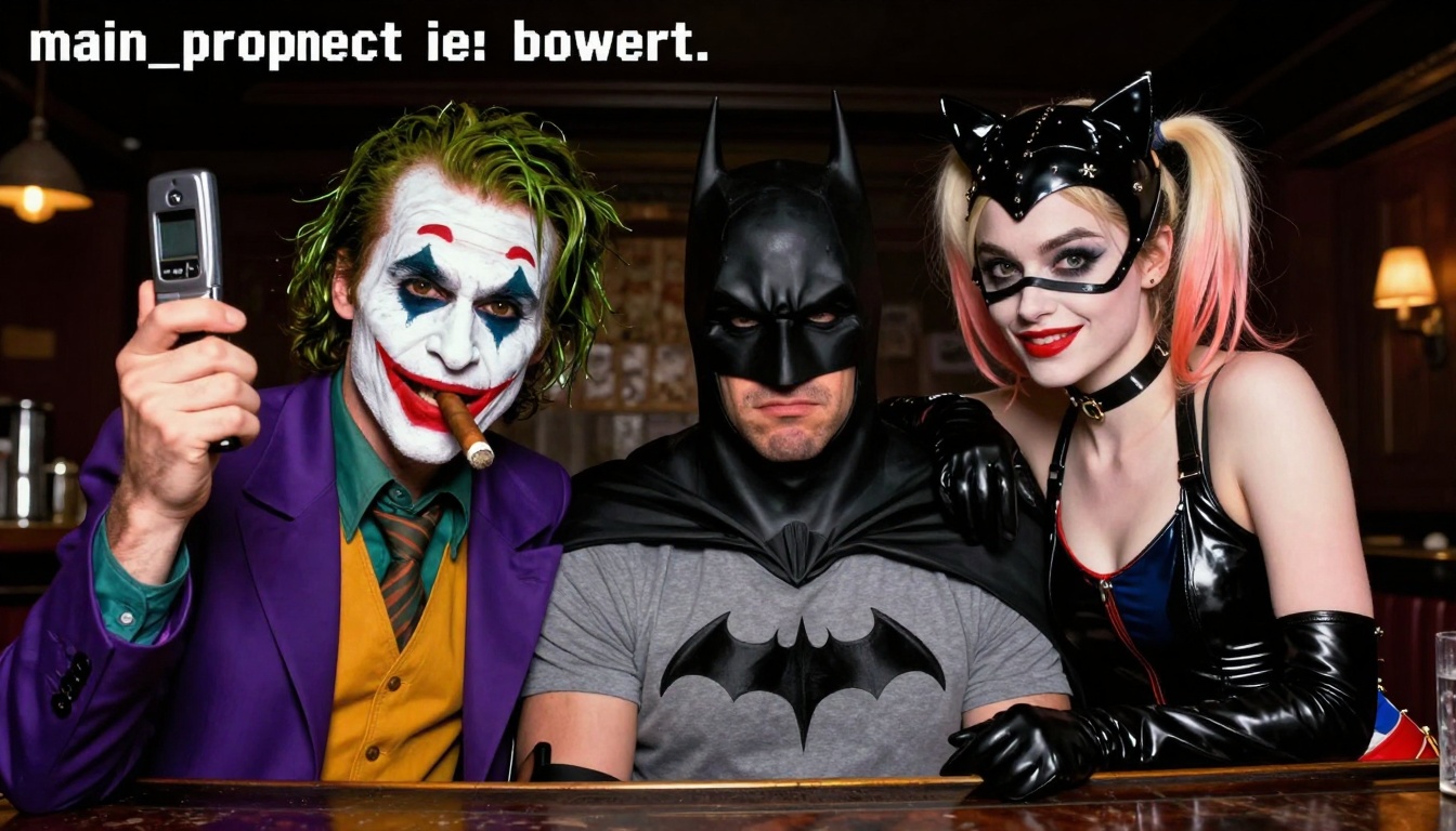 A nostalgic VGA selfie featuring Joker, Batman, Catwoman, and Harley Quinn in a dive bar setting.