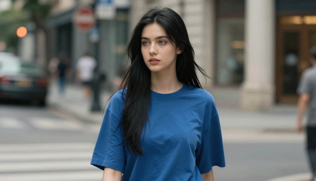 A cinematic close-up of a young woman walking thoughtfully on a sunny city street, showcasing warm film aesthetics.