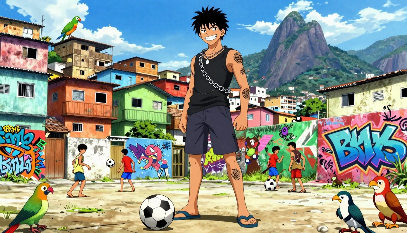 Onizuka Eikichi depicted in colorful Rio favelas, blending manga style with vibrant street life and wildlife.