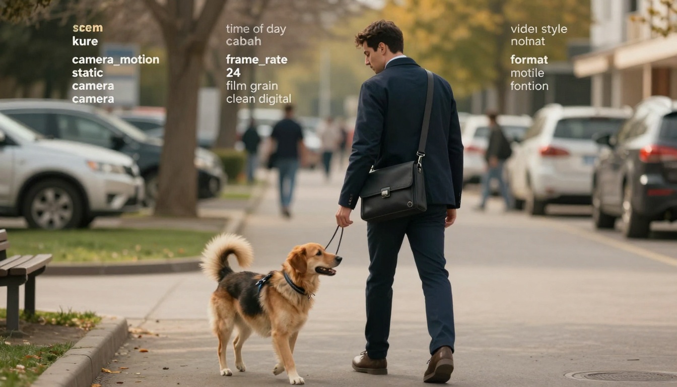 A cinematic shot of a corporate man walking casually in a warm-lit parking lot during the morning.