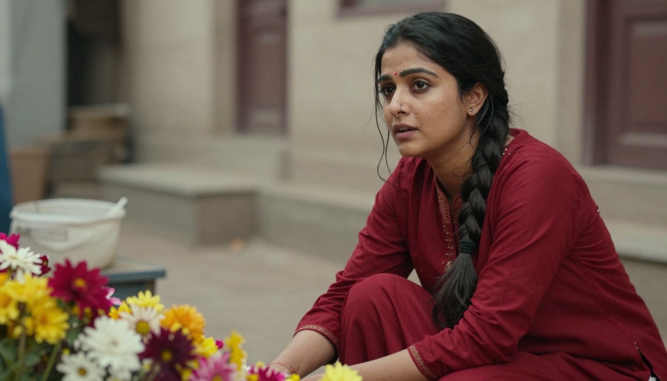 A documentary-style scene of Anjali comforting an old flower seller in a vibrant Indian bazaar during golden hour.