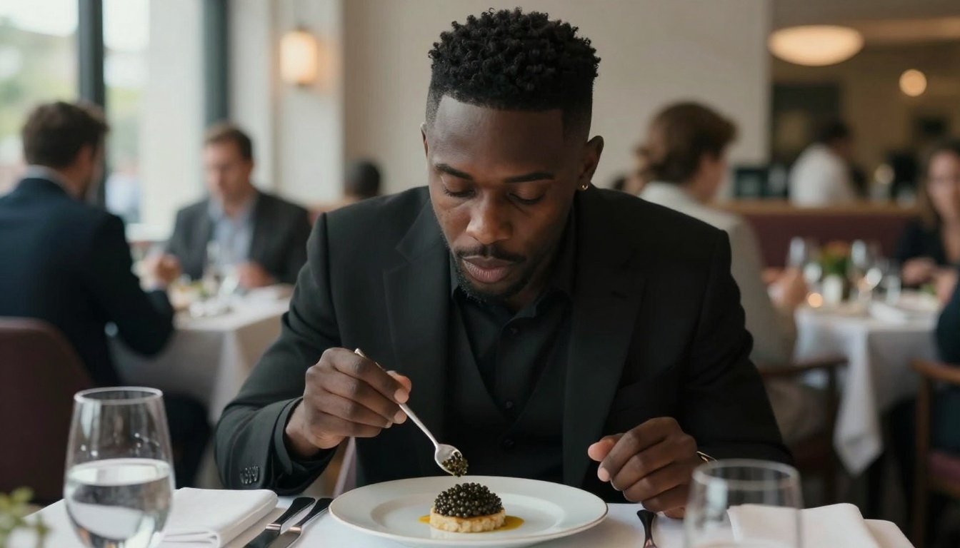 A relaxed scene of a Black man enjoying caviar in a Michelin star restaurant during the afternoon.