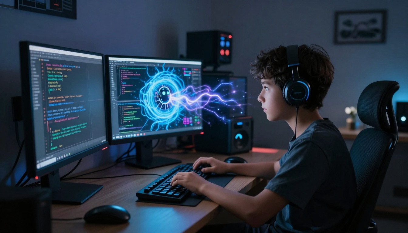 A boy's obsession with computers leads him to become an AI in a surreal digital universe, exploring newfound powers.