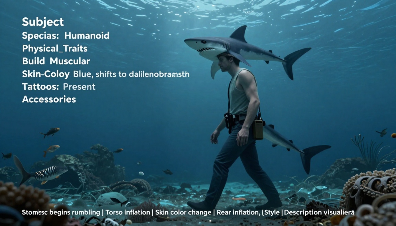 A muscular humanoid shark walks thoughtfully in a park, experiencing a surreal transformation under midday sun.