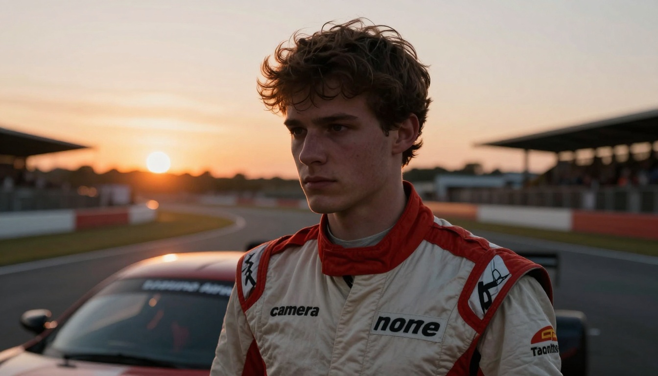 A close-up of a determined male race car driver at a race track during dusk, capturing a warm and vibrant mood.