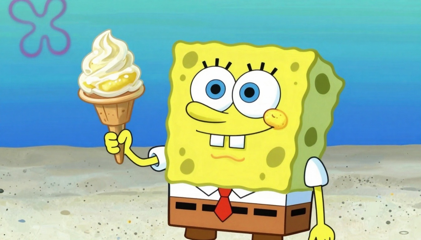 SpongeBob SquarePants joyfully enjoying durian ice cream in vibrant Bikini Bottom.