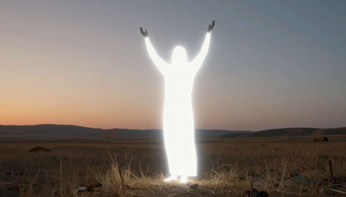 A fantasy depiction of Prophet Noah in an ancient landscape, radiating light and uplifting emotions with serene music.