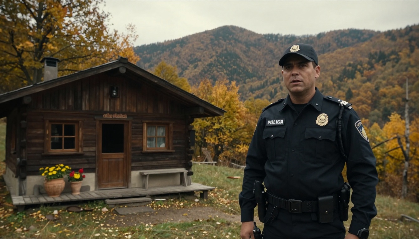 A tense but calm interaction between a police officer, an elderly woman, and a bear in a rustic mountain setting.