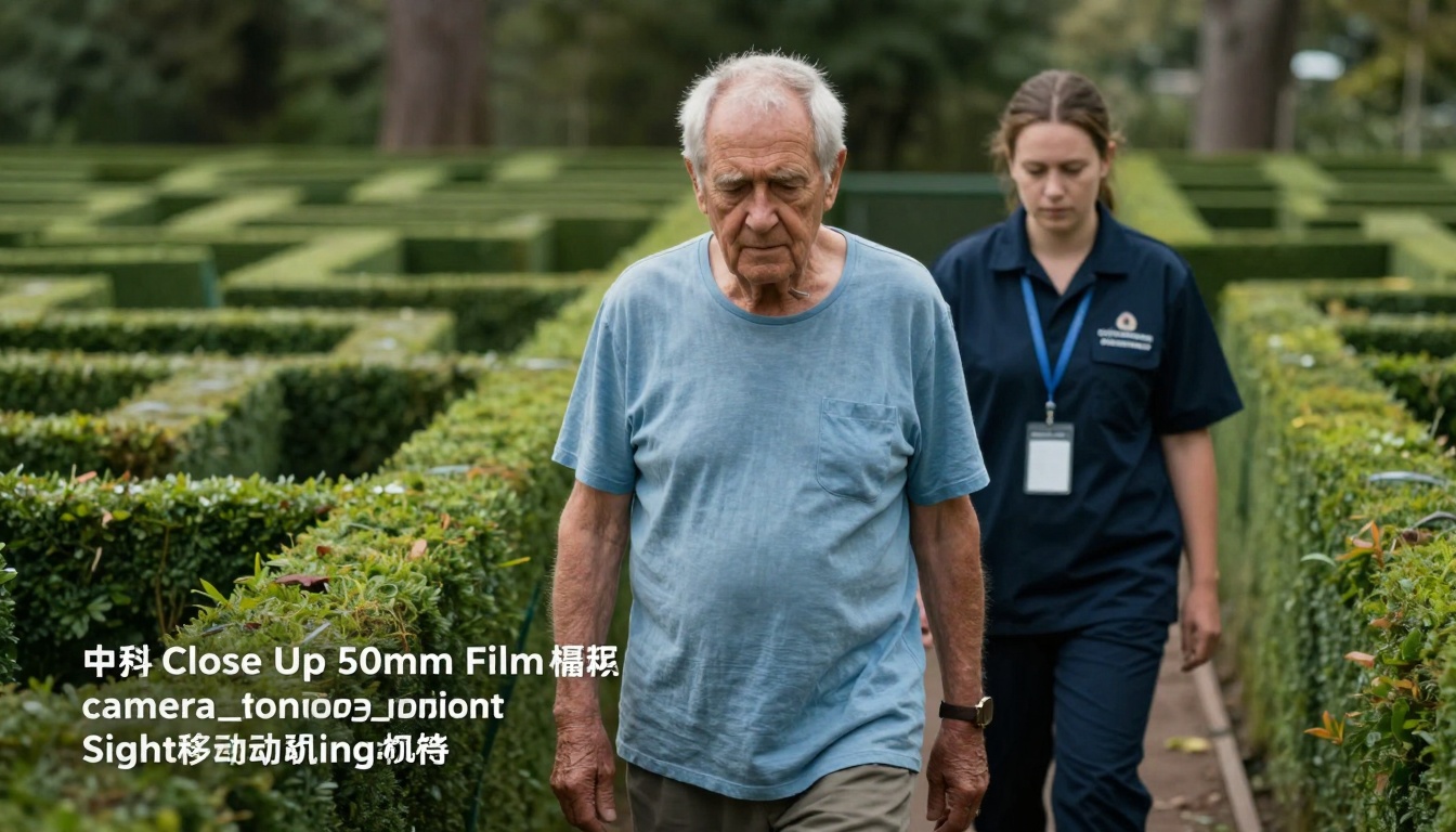 An intimate portrayal of an elderly man lost in a maze, guided by a supportive worker in soft morning light.