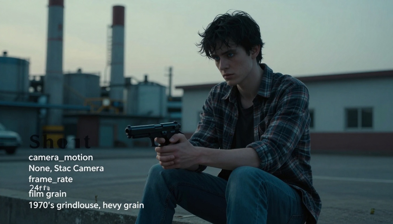 A young male gently rubs a handgun outside a factory during the soft light of magic hour.