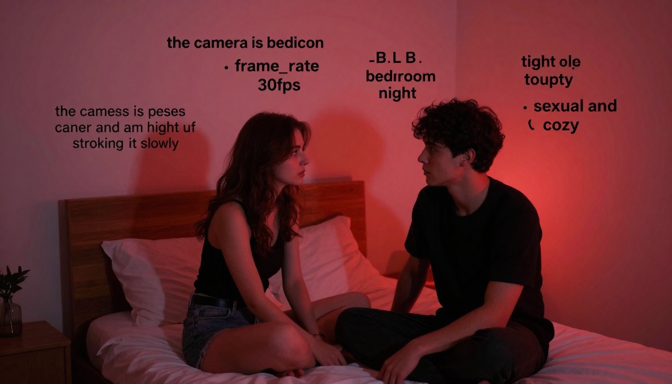 A cinematic portrayal of a couple in a cozy, dimly lit bedroom, exploring intimacy with nervous energy.