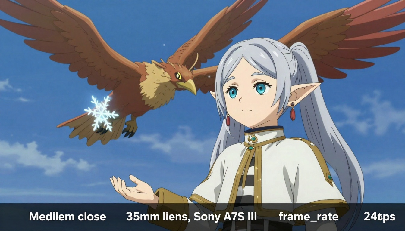 A medium close-up of Frieren levitating while casting a spell, with Articuno in the background creating snowflakes.