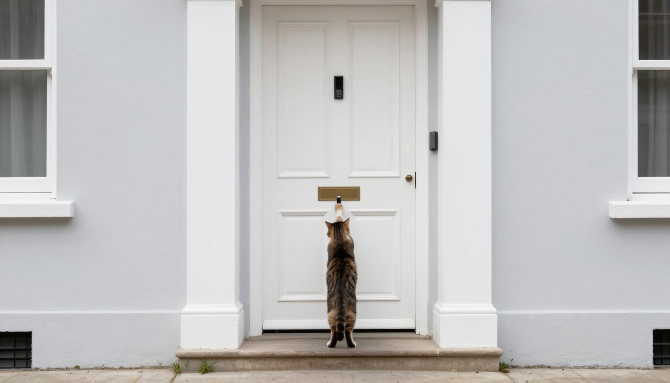 A realistic scene of a cat reaching to ring the doorbell of a white house, captured in bright daylight with cinematic detail.