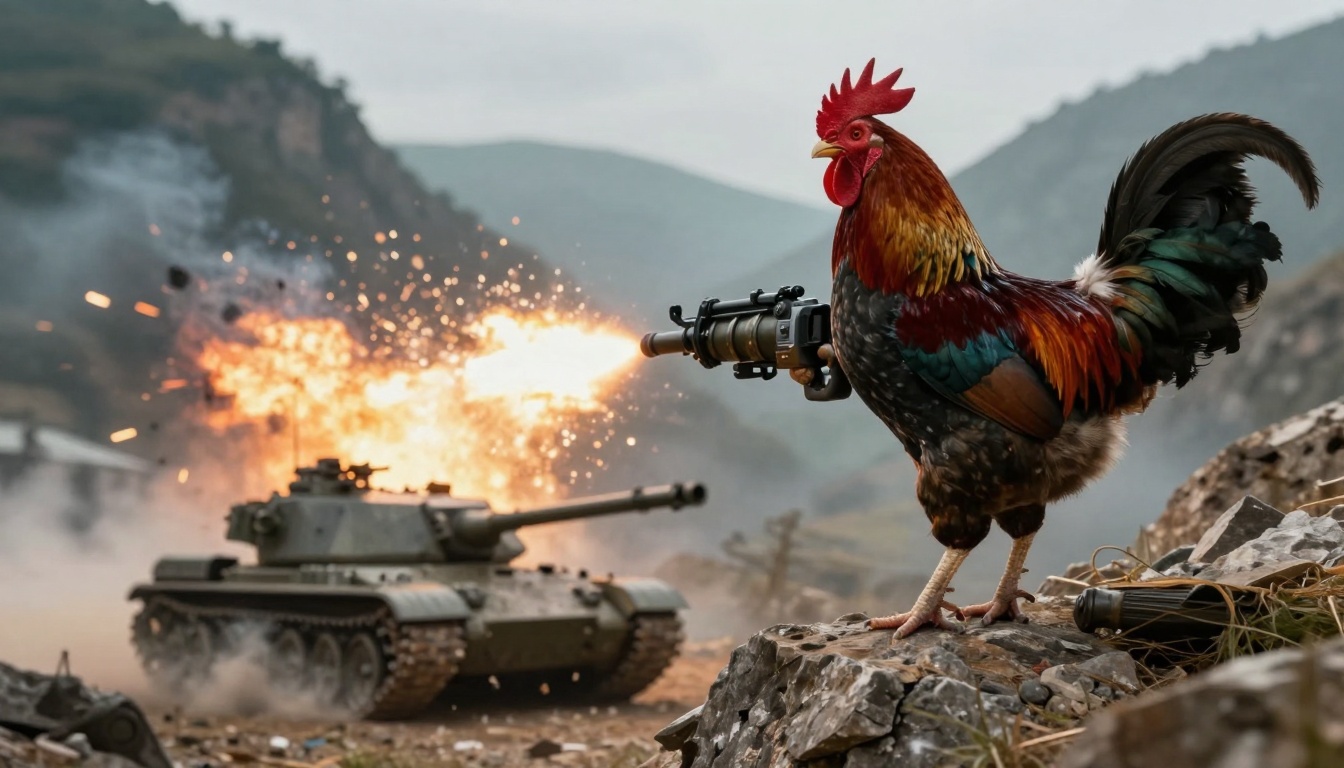 A heroic rooster fires a grenade launcher at a tank in a dramatic mountain scene, featuring cinematic action and stunning visuals.