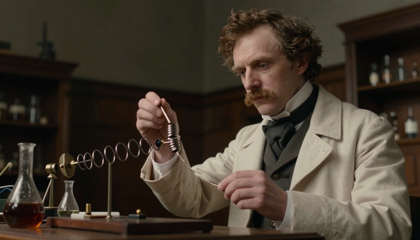 A dramatic low-angle shot of Michael Faraday conducting an experiment in a 19th-century laboratory, highlighting magnetism and electricity.